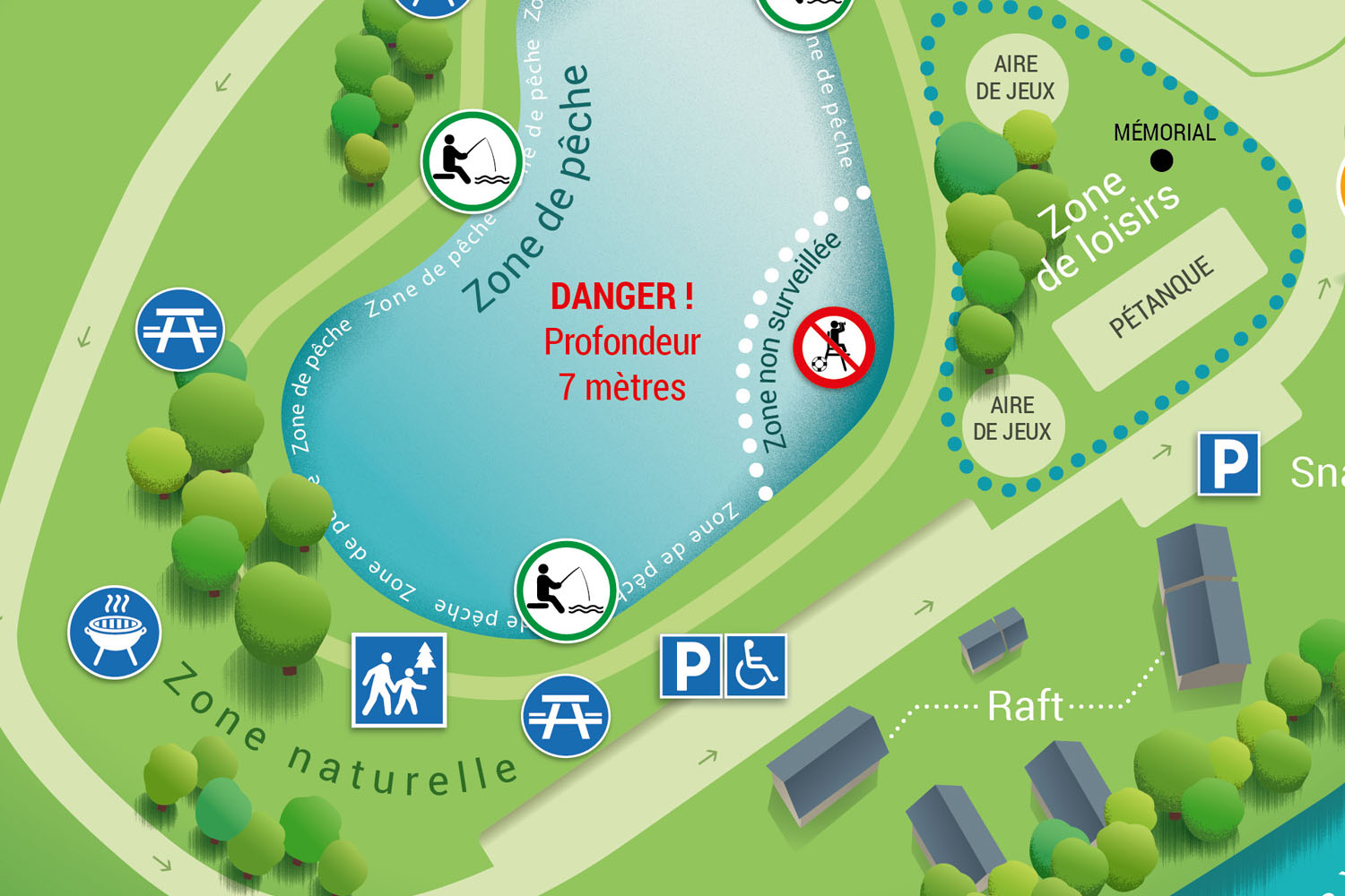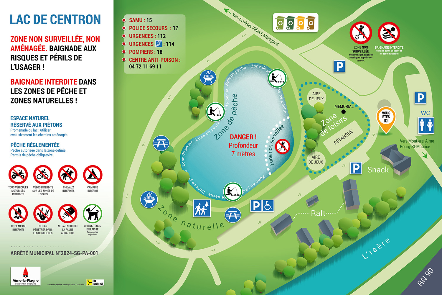 Conception et réalisation graphique des panneaux d’accueil 120×80 cm implantés sur la base de loisirs du Lac de Centron, sur la commune d’Aime-La-Plagne. Pour ce projet, j’ai proposé un style vectoriel assez épuré, afin de ne pas surcharger un visuel déjà très dense en informations… J’ai également crée l’ensemble des icônes utilisées.